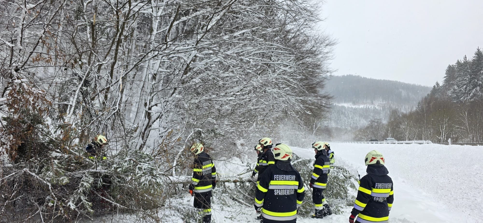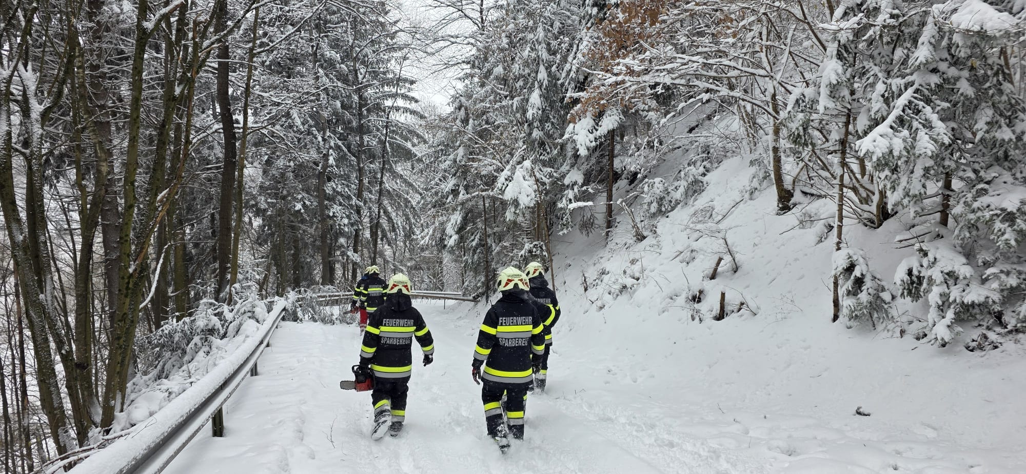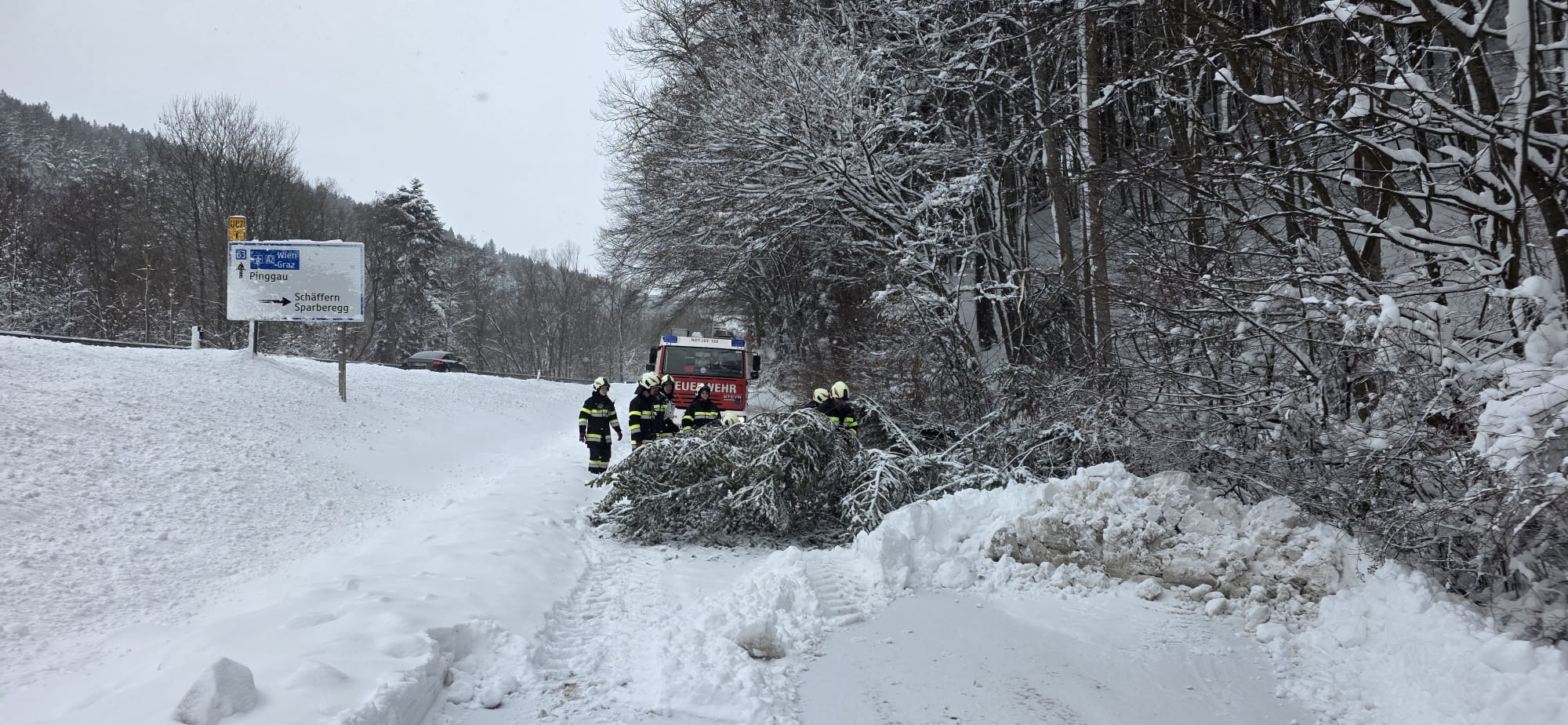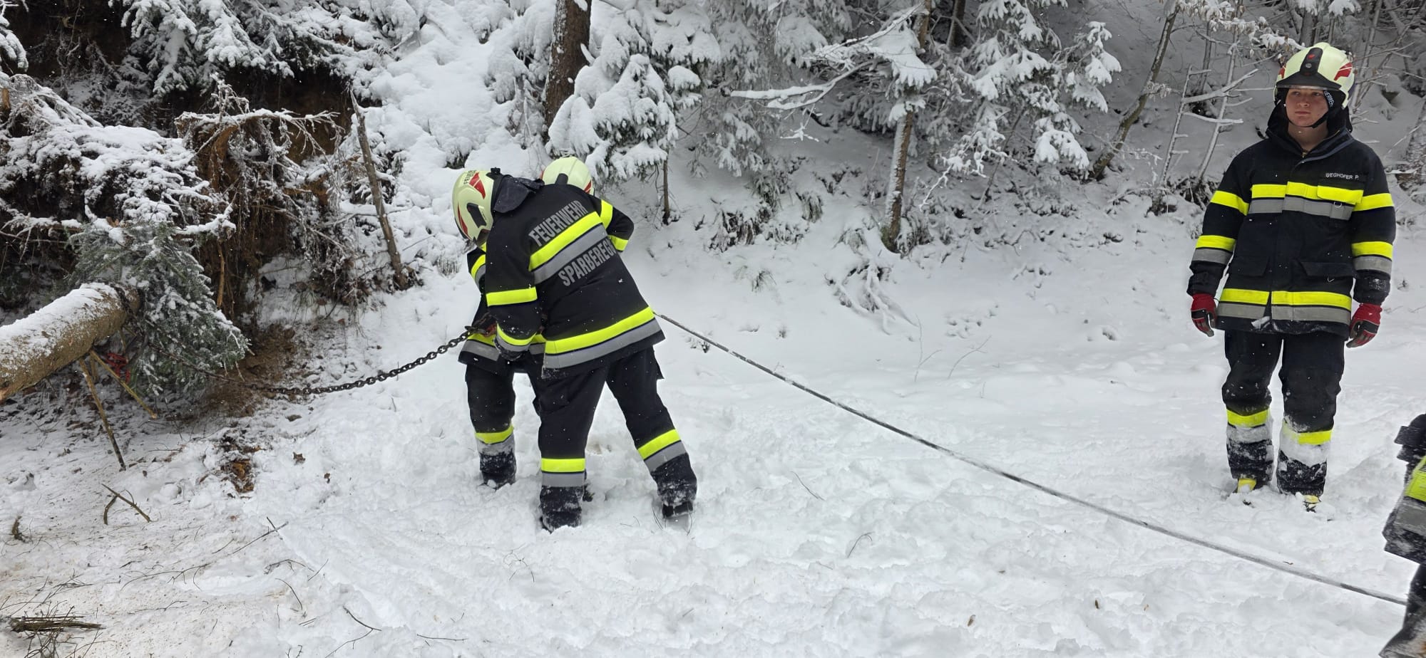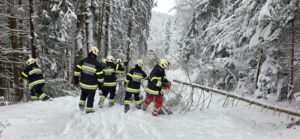 Zum zweiten Mal an diesem Tag wurden die Mitglieder der FF Sparberegg mittels Rufempfänger zu mehreren umgestürzten Bäumen auf die alte B63 zwischen Schäffernsteg und Sinnersdorf gerufen. Doch bereits auf der Anfahrt versperrten mehrere Bäume die Gemeindestraße zwischen Sparberegg und Schäffernsteg. Diese wurden von der Fahrbahn entfernt und der eigentliche Einsatzort wurde angefahren. Doch bereits am Schäffernsteg gab es den nächsten Zwischenstopp. Ein LKW war auf der L423 kurz nach der Kreuzung zur B63 hängen geblieben. Dieser wurde geborgen und konnte seine Fahrt anschließend fortsetzen. Zu guter Letzt wurde der eigentliche Einsatz abgearbeitet. Um 13:00 Uhr konnte dann die Einsatzbereitschaft gemeldet werden. Ein herzlicher Dank gilt allen Kameradinnen und Kameraden die bei diesen widrigen Wetterbedingungen stundenlang im Einsatz standen!