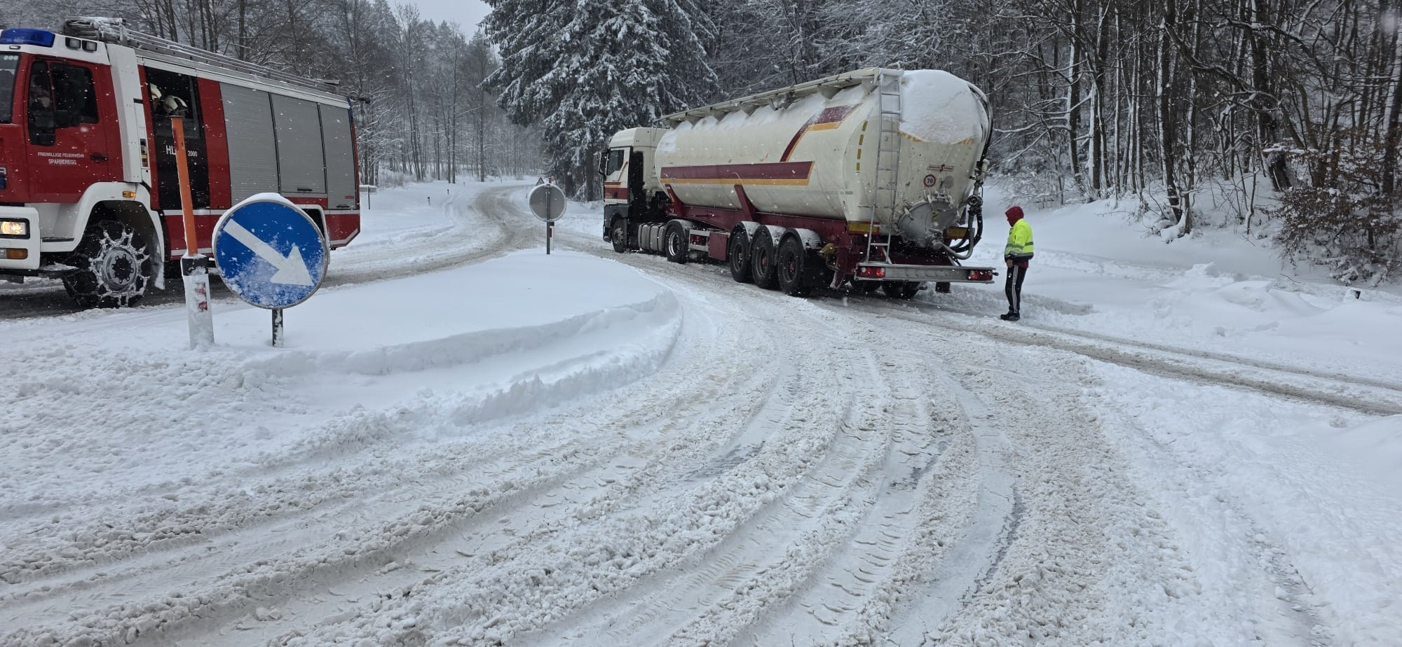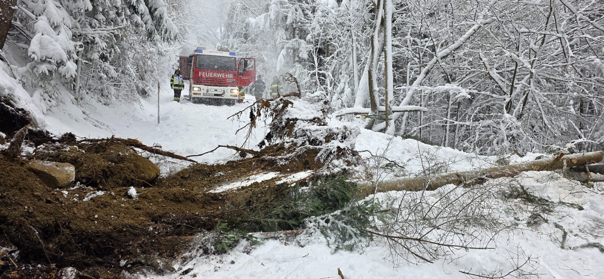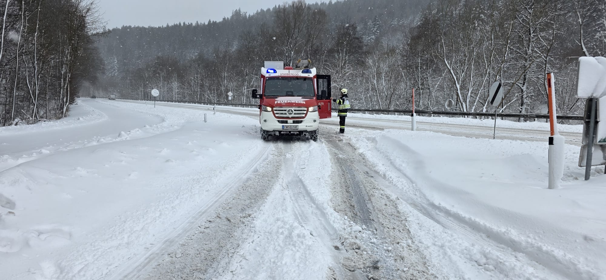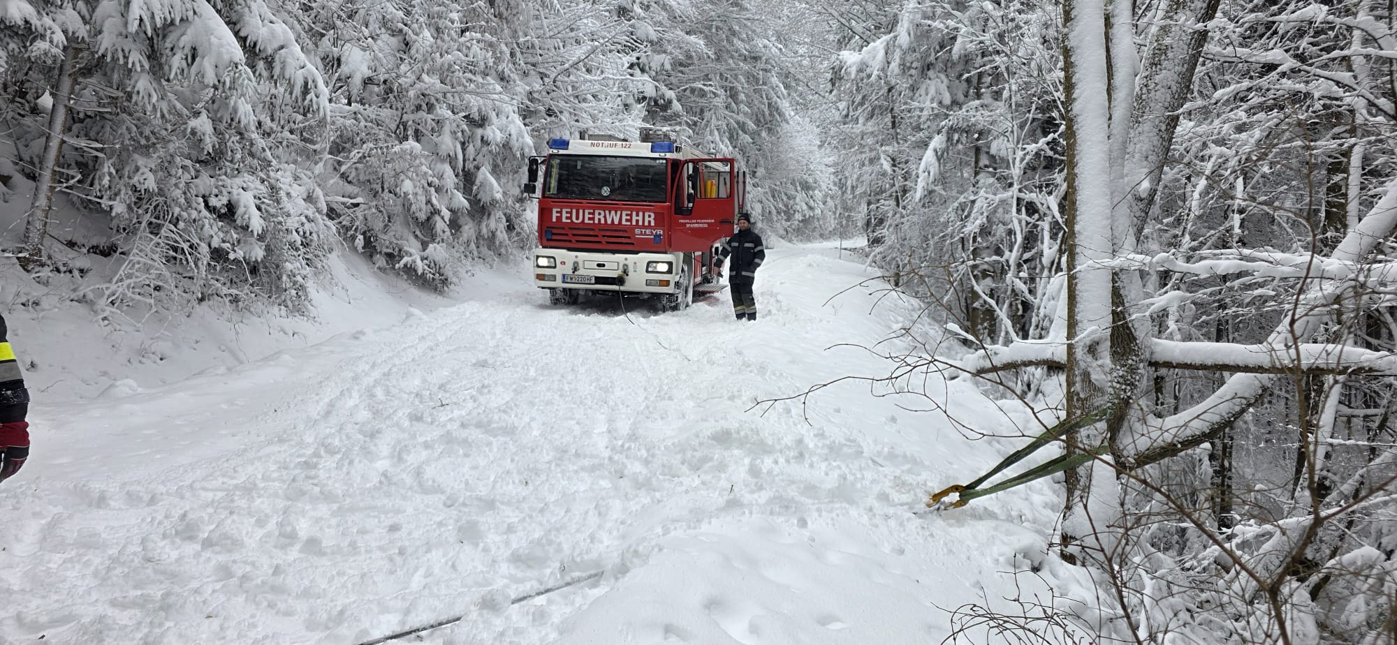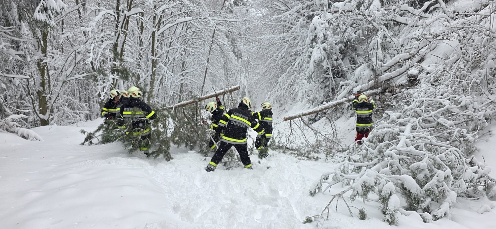 Zum zweiten Mal an diesem Tag wurden die Mitglieder der FF Sparberegg mittels Rufempfänger zu mehreren umgestürzten Bäumen auf die alte B63 zwischen Schäffernsteg und Sinnersdorf gerufen. Doch bereits auf der Anfahrt versperrten mehrere Bäume die Gemeindestraße zwischen Sparberegg und Schäffernsteg. Diese wurden von der Fahrbahn entfernt und der eigentliche Einsatzort wurde angefahren. Doch bereits am Schäffernsteg gab es den nächsten Zwischenstopp. Ein LKW war auf der L423 kurz nach der Kreuzung zur B63 hängen geblieben. Dieser wurde geborgen und konnte seine Fahrt anschließend fortsetzen. Zu guter Letzt wurde der eigentliche Einsatz abgearbeitet. Um 13:00 Uhr konnte dann die Einsatzbereitschaft gemeldet werden. Ein herzlicher Dank gilt allen Kameradinnen und Kameraden die bei diesen widrigen Wetterbedingungen stundenlang im Einsatz standen!