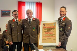 Als Dank und Anerkennung für seine langjährigen Verdienste und seiner 20-jährigen Funktion als Gruppenkommandant von 1992-2012 wurde HLM Franz Pfeffer von der Wehrversammlung einstimmig zum Ehrenhauptlöschmeister ernannt.