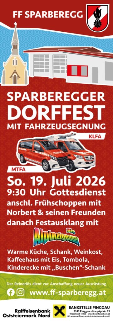 Die Freiwillige Feuerwehr Sparberegg lädt euch wieder zum Sparberegger Dorffest am Sonntag, dem 19.07.2026 ein!